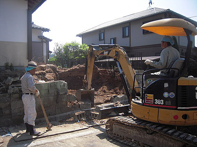 | 庭木撤去後は駐車場確保のため既存ブロックとケンチ石の解体、盛土の処分をし、まず、ブロックを解体したら排水の確保をします。雨水、汚水、水道、ガス管が出て来ると工事がてこずります。でもそこはプロにお任せください。 |