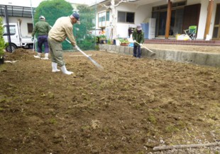 | 表層にも砂などを入れ水が溜まらないようにします。 耕運土壌を再度機械にて混ぜ込み土壌の改良です。 |