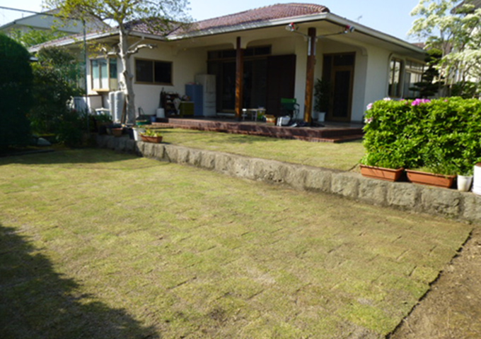 | 芝庭は作庭後30年で、ご主人様がネットを張りゴルフの練習をされてあります。毎年の芝生管理はご主人様が専用機械にて芝刈りなどされてありますが、草が多くなり芝生の色が悪く元気がないので再生、もしくは張替で専門業者を探してあり芝張り作業のご依頼を頂きました。 |